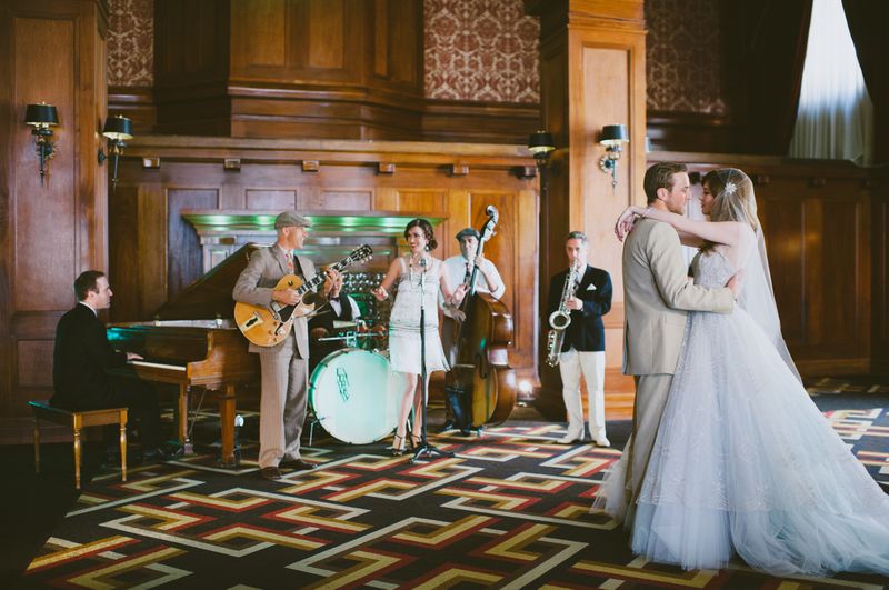 Photography: Heidi Ryder Photography | Florals: Rosebud Floral Designs |Design: Wish Wonder Dream | Videography: Visioneer Media |Hair & Makeup: Angela Tam | Makeup Artist and Hair Design Team | Venue: The Los Angeles Athletic Club |Vintage Furniture & Rentals: Found Vintage Rentals | Table Settings and Chairs: Town and Country Event Rentals | Bridal Gown: Lazaro | Bridal Headpieces: Gilded Shadows |Groom’s Bow Tie/Pocketsquare: Klein Epstein & Parker | Cake: The Cake Studio | Band: The New Recessionaires | Stationery: Simply Letterpressed | Pocketwatch: Ingredients for Lovely|Star Chandelier: Paper Lantern Store |Gold Garland: Art’s Delight